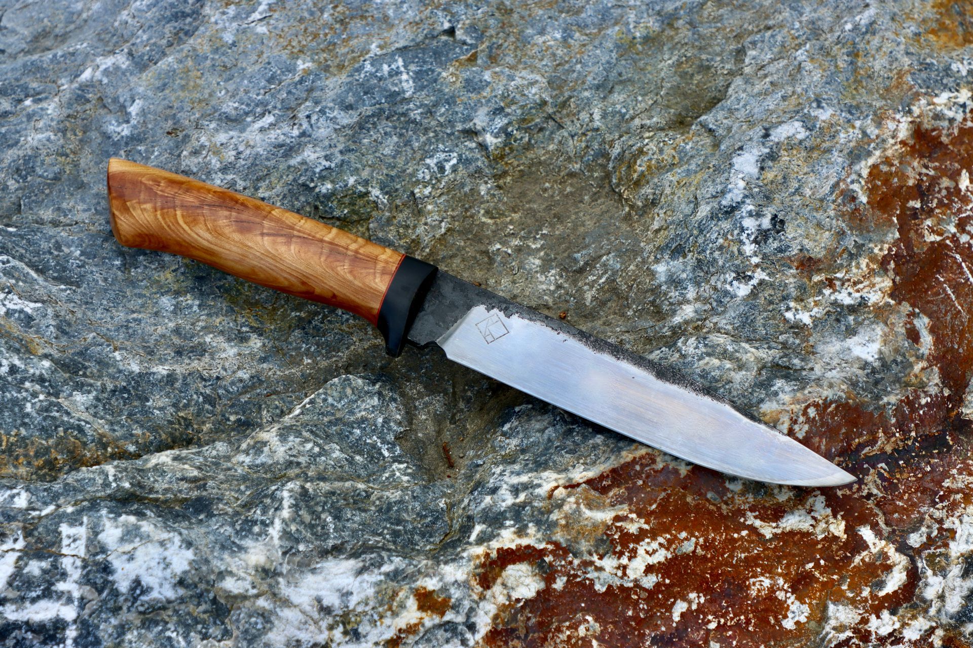 Ausgangsmaterial für die Klinge dieses Messers war ein altes Kugellager aus 100Cr6. Der Stahl ist ein echter allrounder und für viele Anwendungen im Messerbereich sehr gut geeignet. Es sind hohe Härten bei guter Zähigkeit erreichbar.