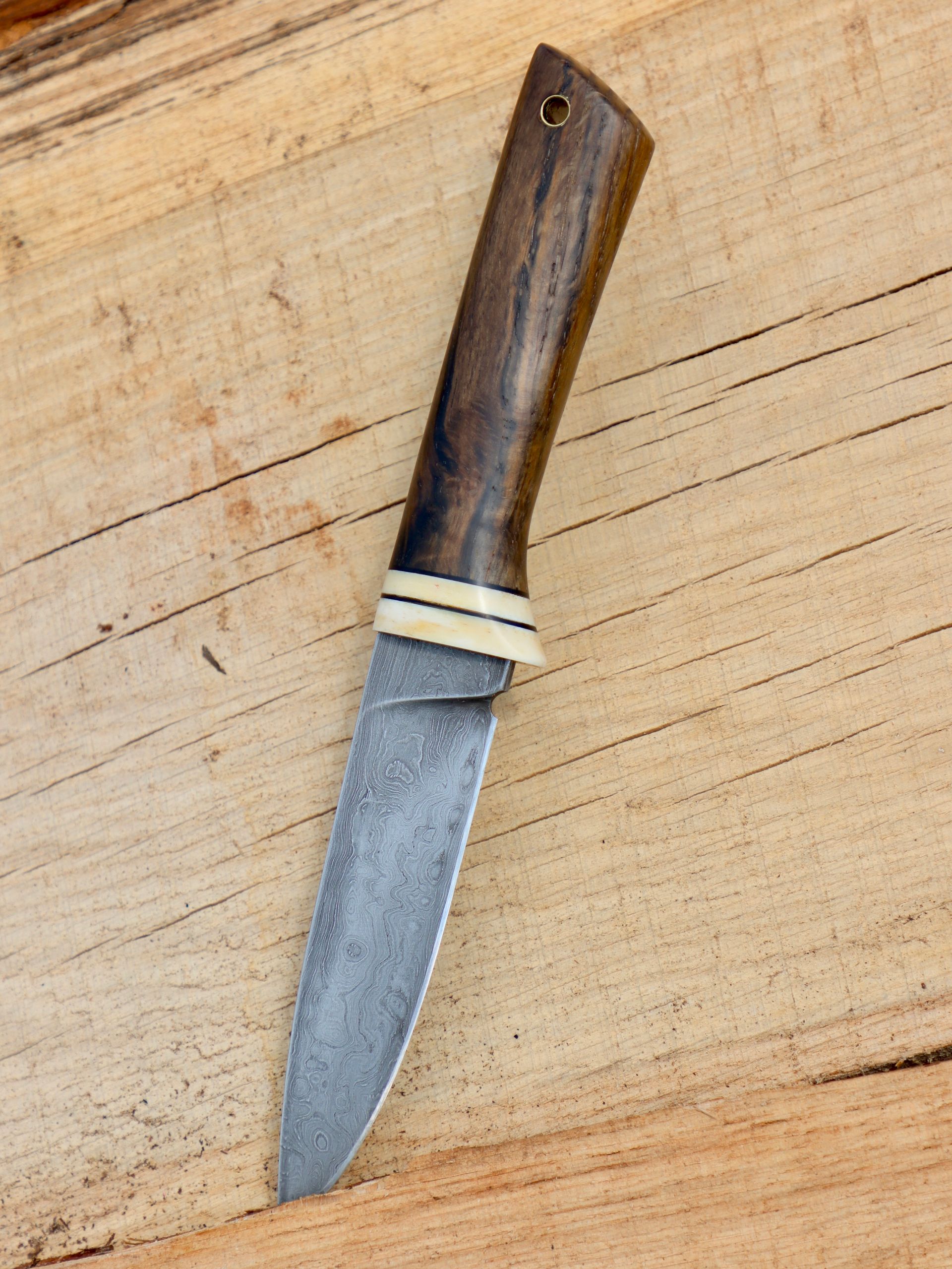 Die Klinge in Drop-Point-Form ist ein guter Allrounder für Jagd, Camping oder Wandern. Aufgrund der Verwendung von Knochen für das Parierelement ist das Messer relativ leicht.