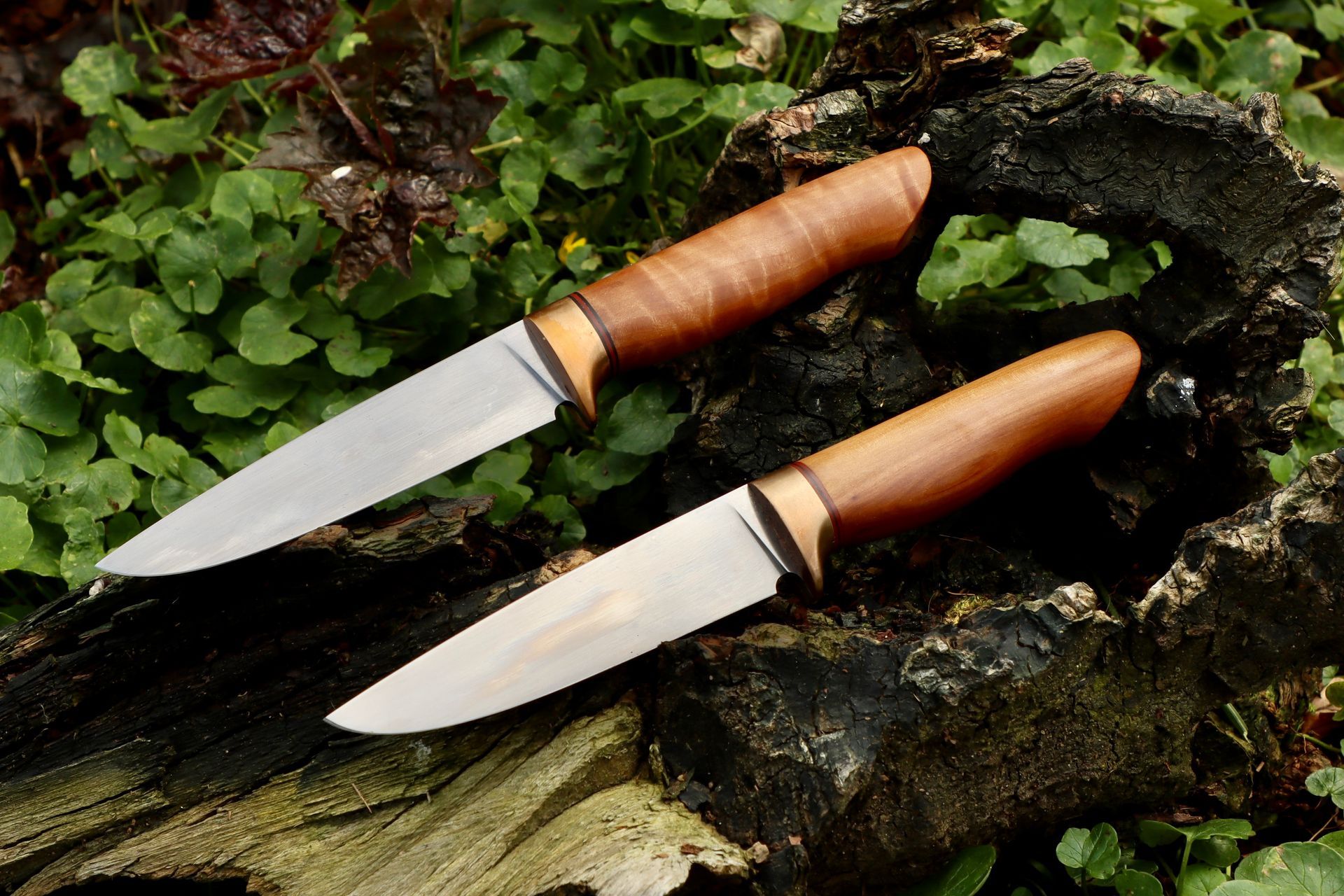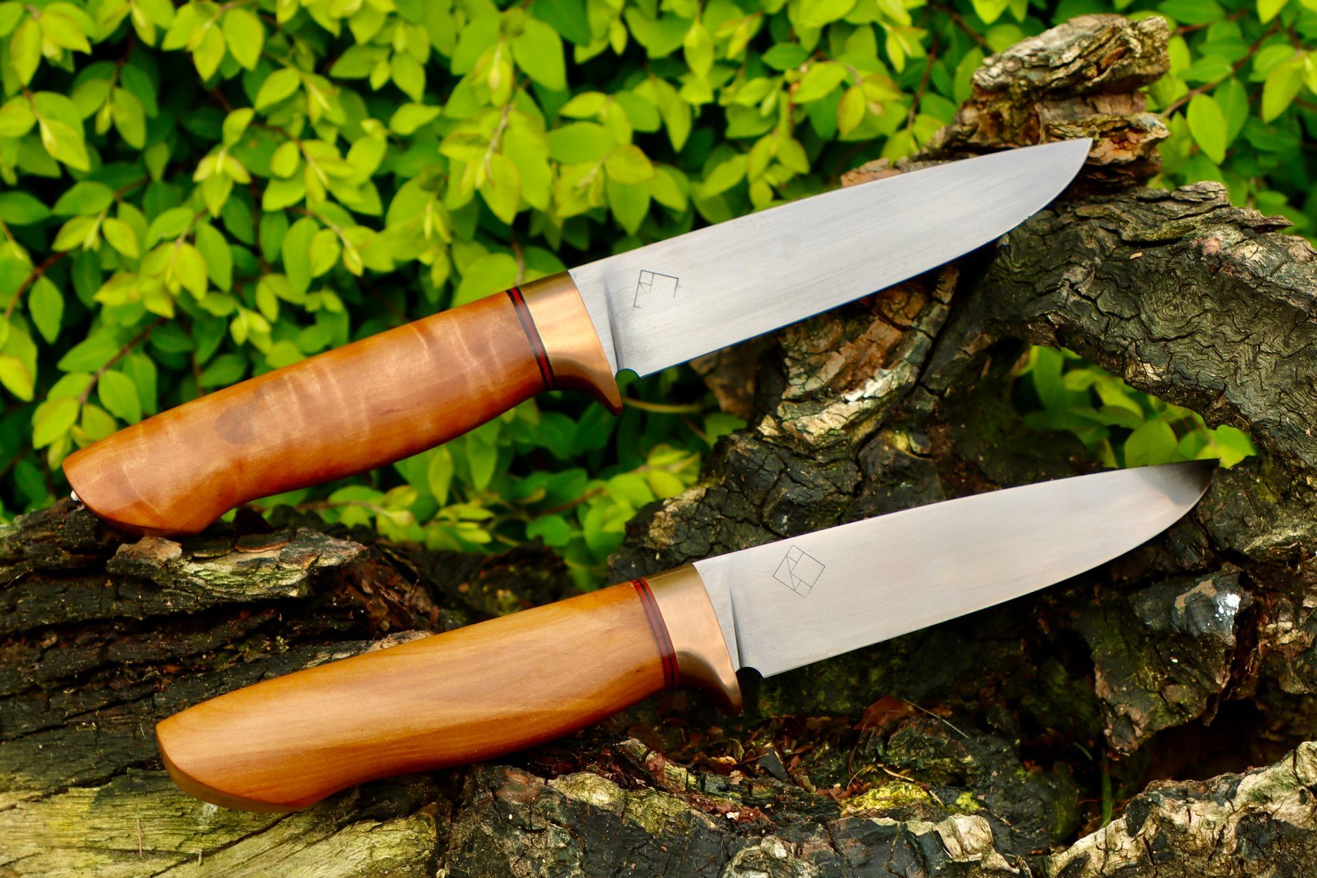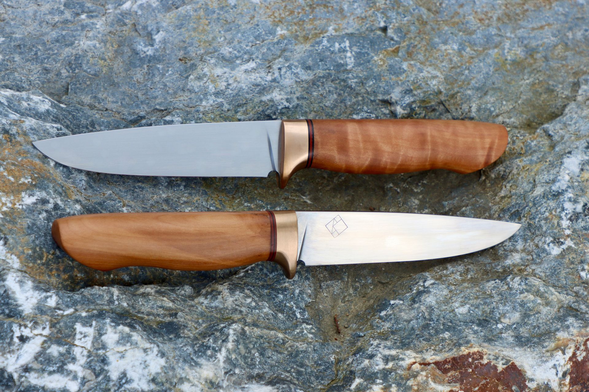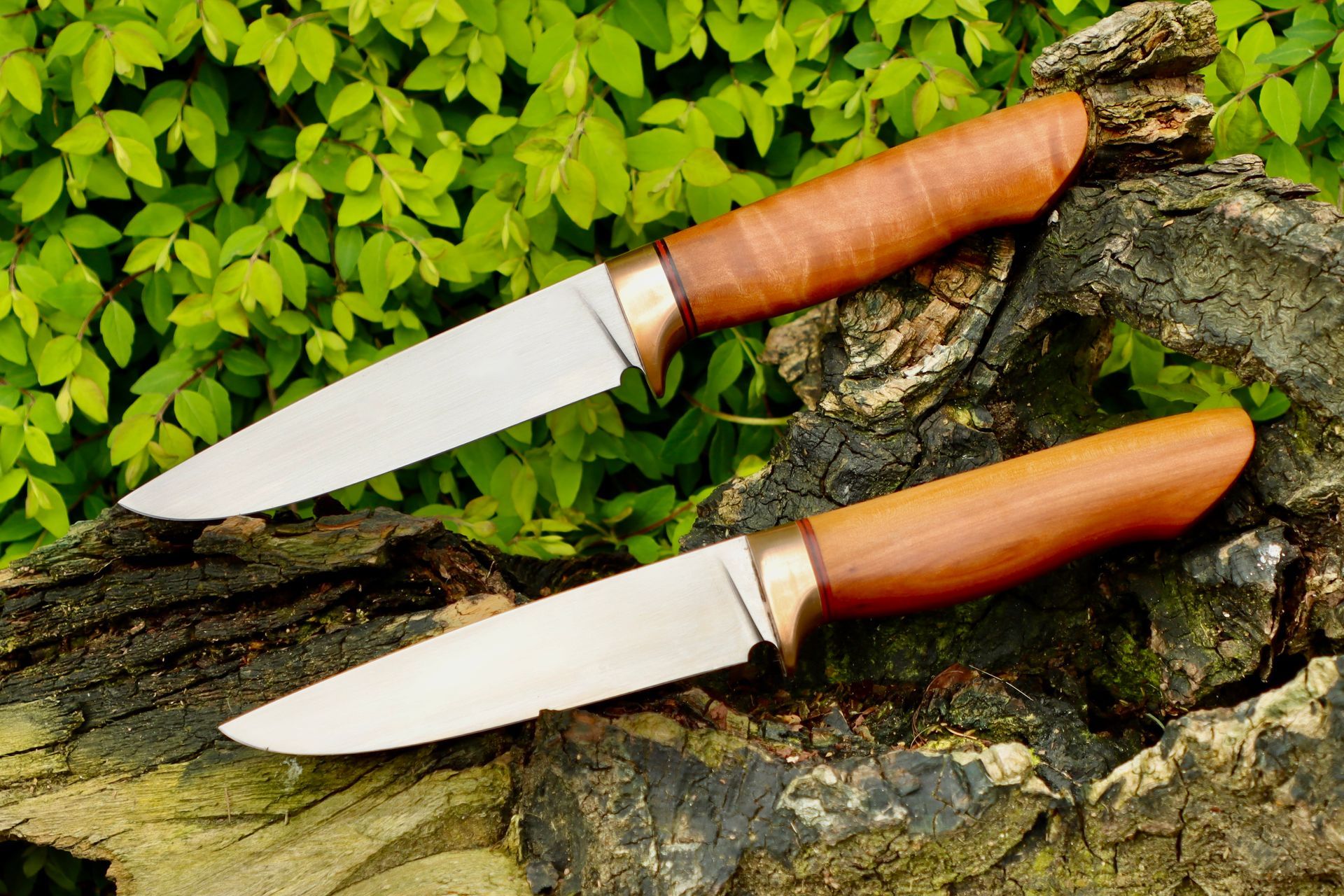 Messerpaar mit verschiedenen Klingenstählen (Vanadis10 und 75Cr1), Griffe aus Apfel- und Birnbaumholz, Parierelement aus Bronze, gefütterte Scheide aus Rindsleder