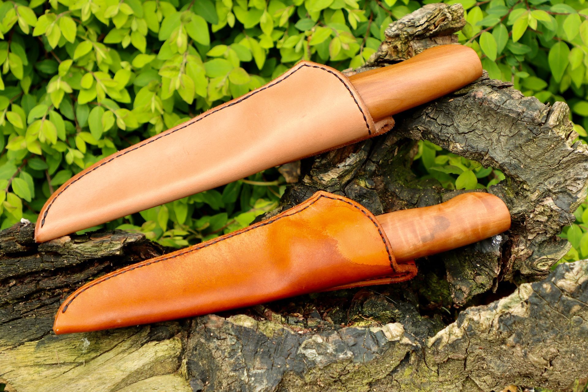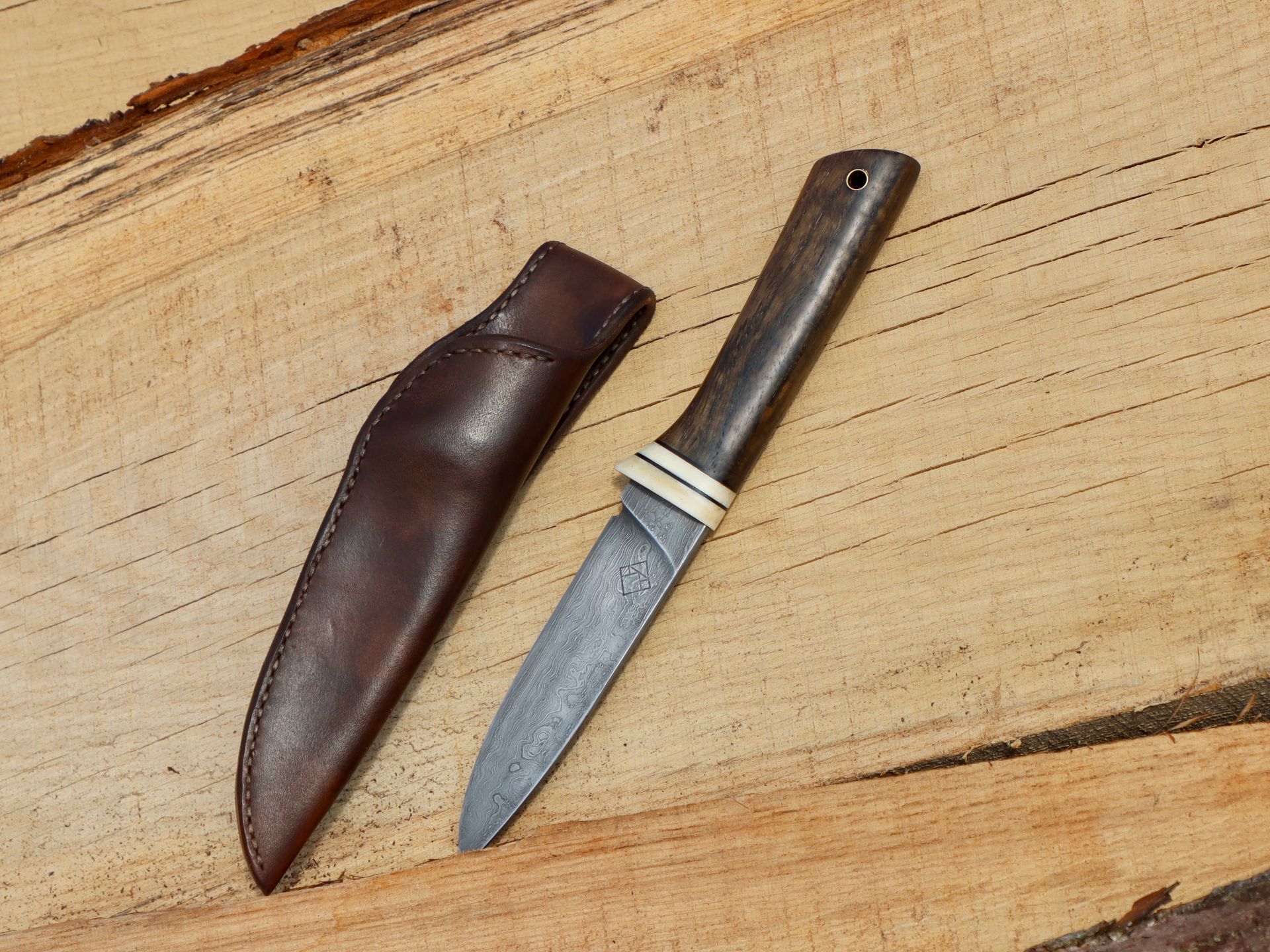 Messer aus wildem Damast, Griff aus Eichenholz, Parierelement aus Rinderknochen, gefütterte Scheide aus Rindsleder