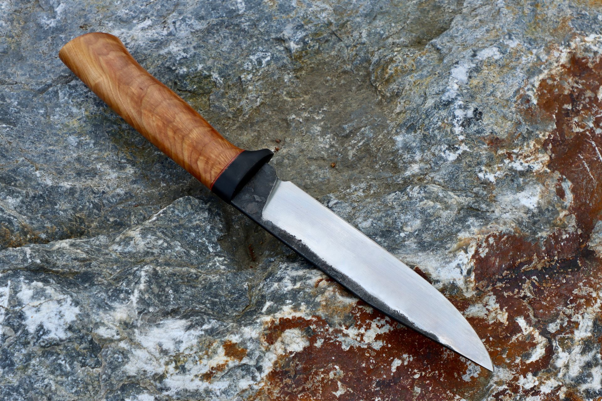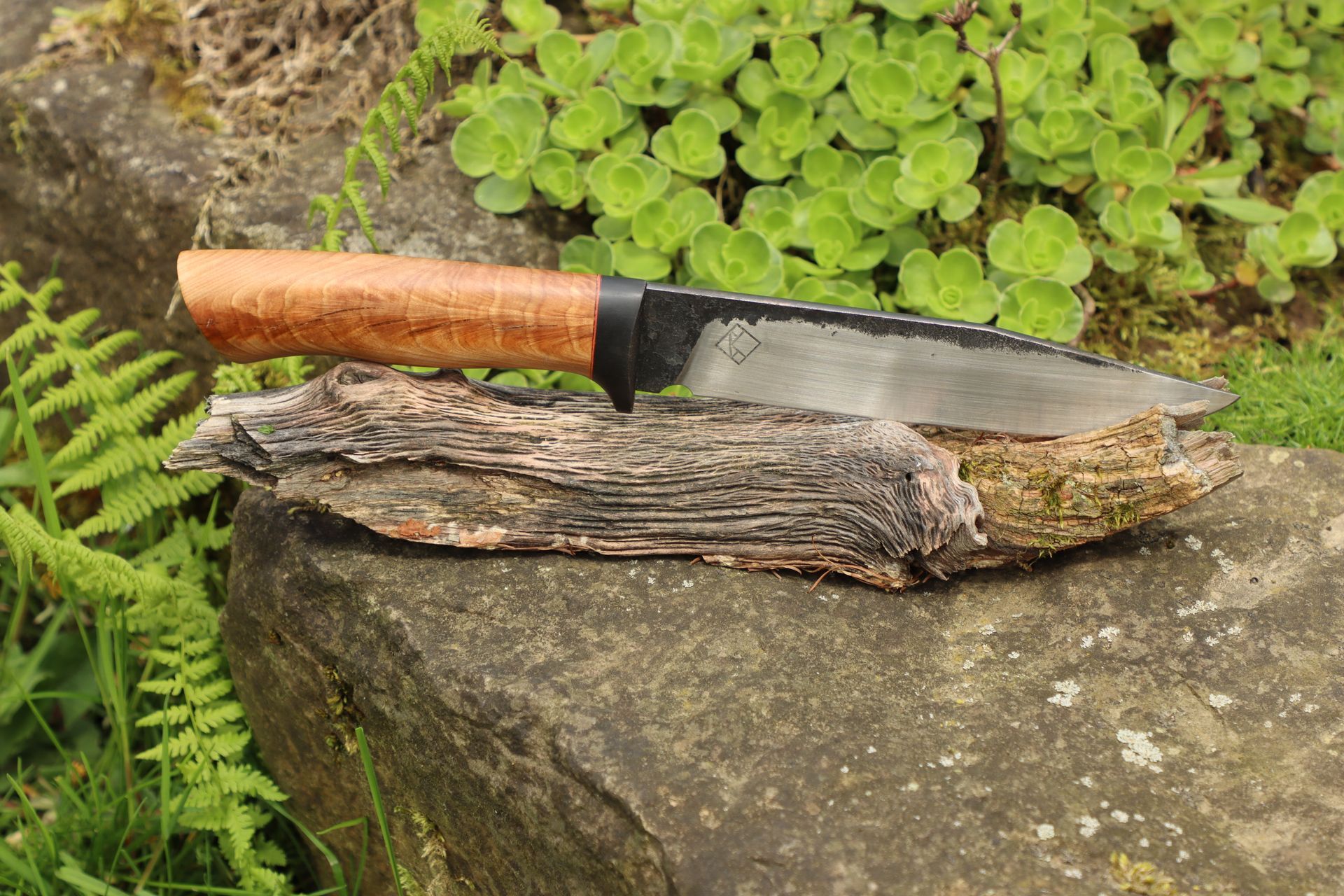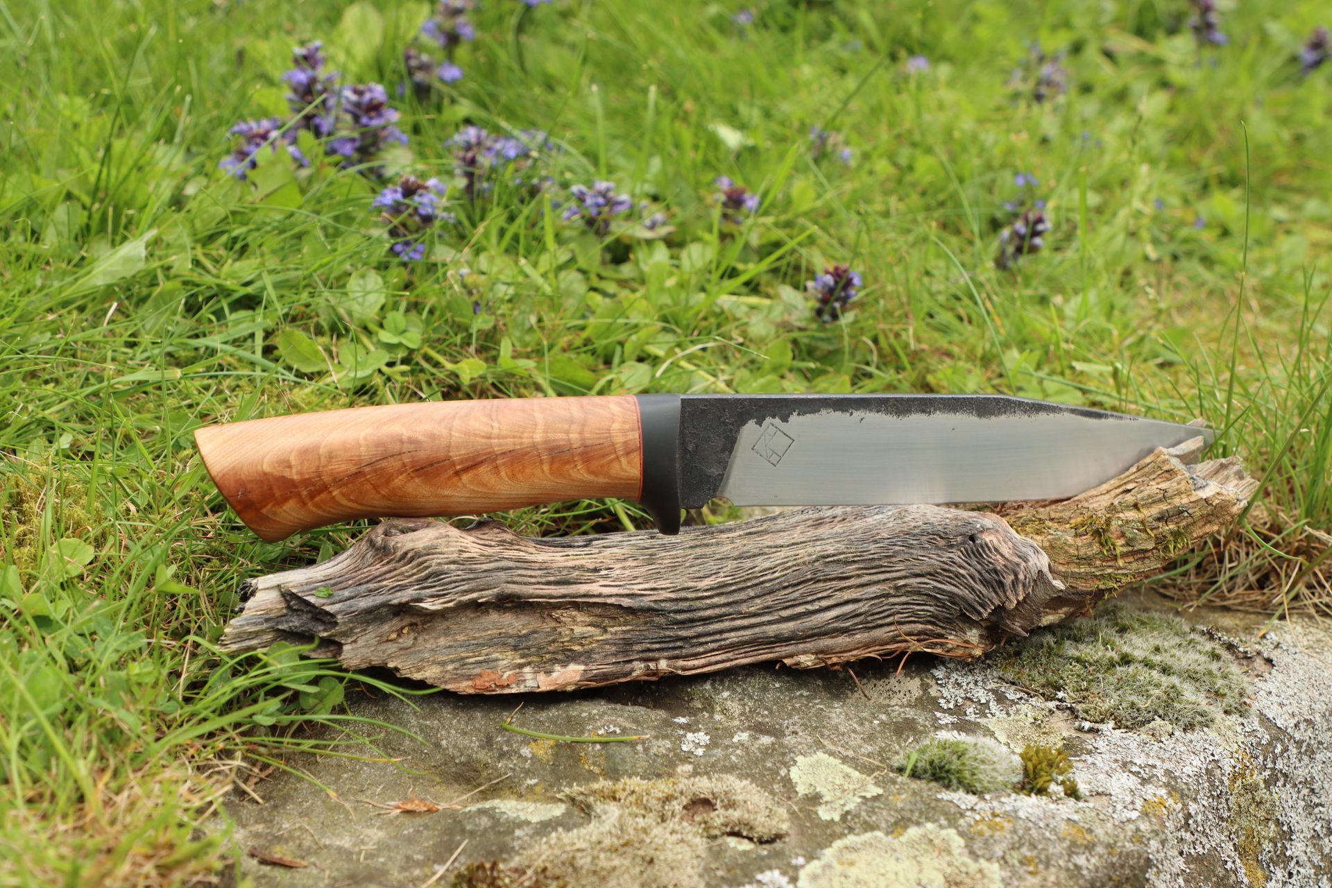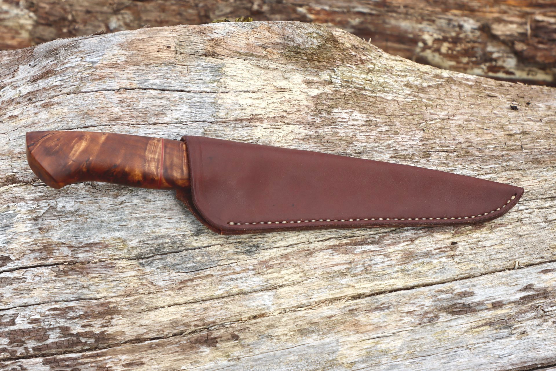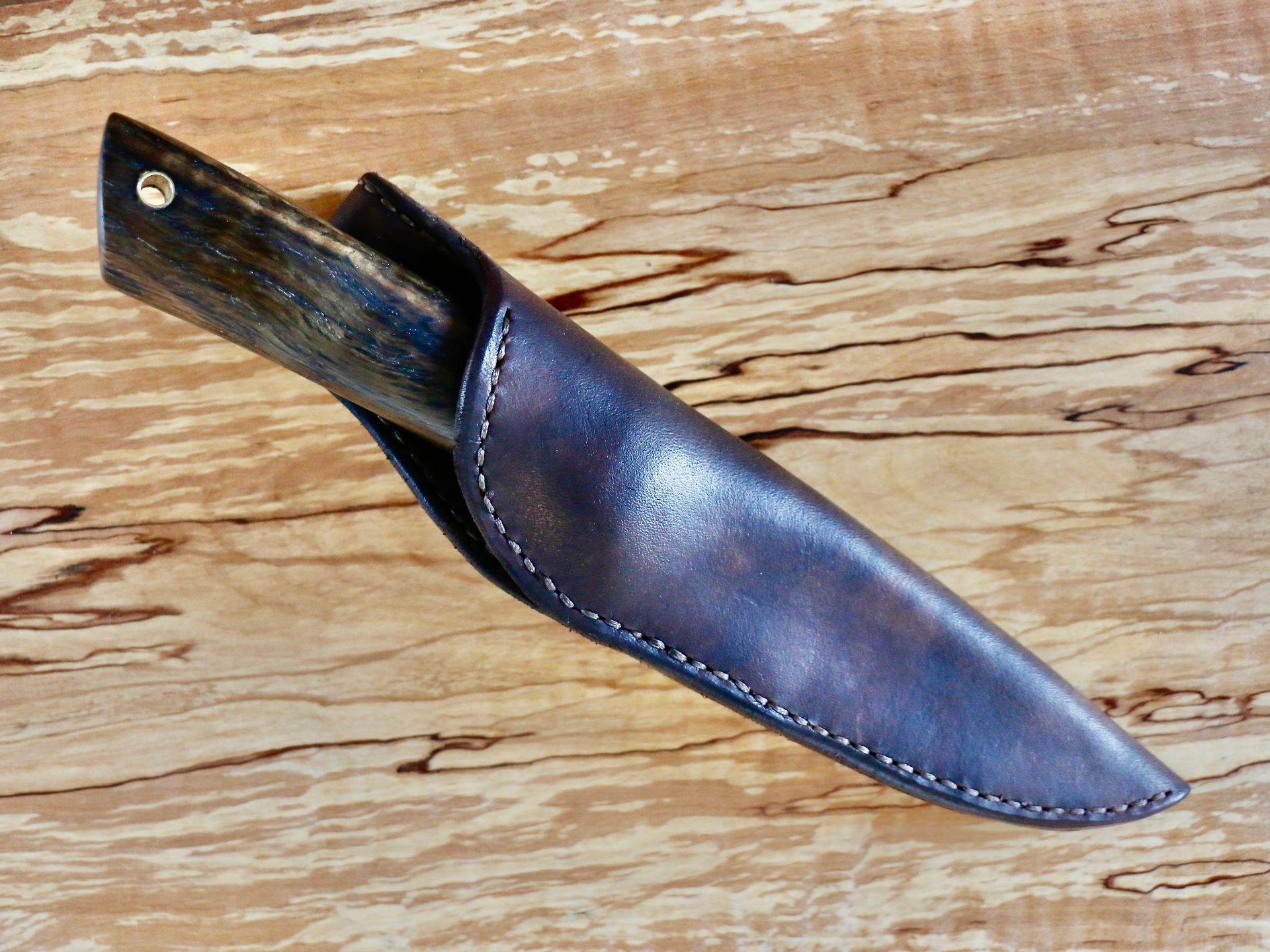 Messer aus 100Cr6, Griff aus Ebereschenholz, Parierelement aus Büffelhorn, Scheide aus Rindsleder