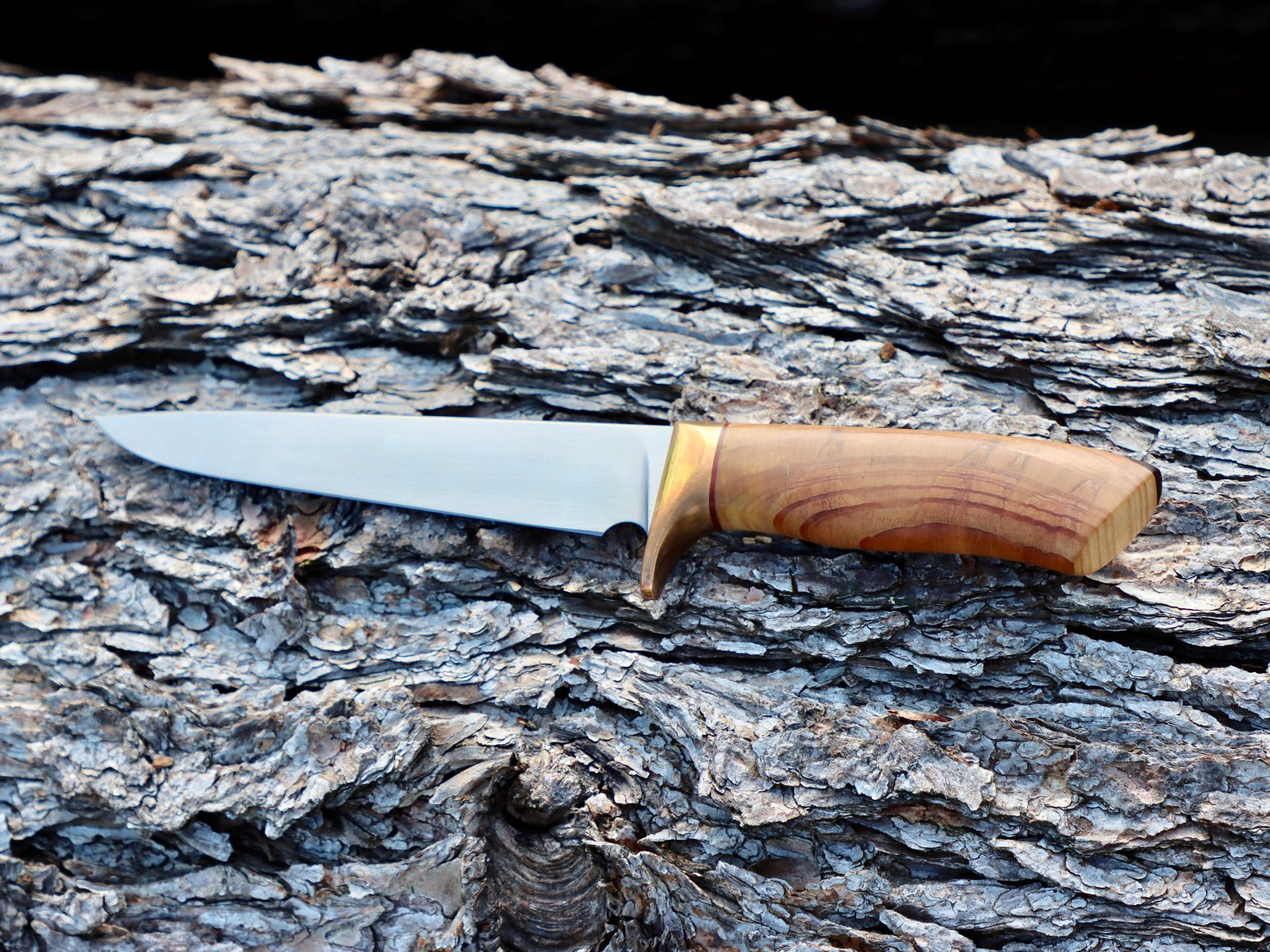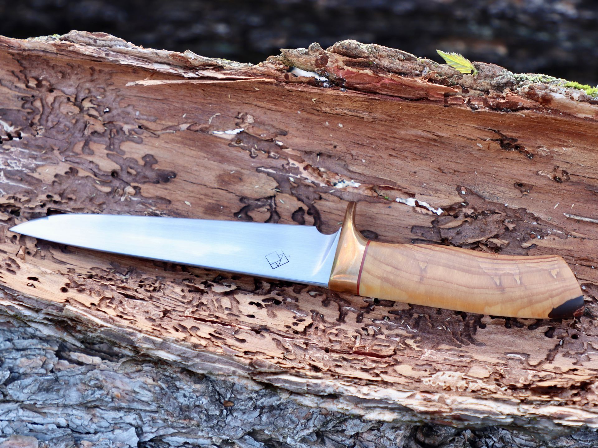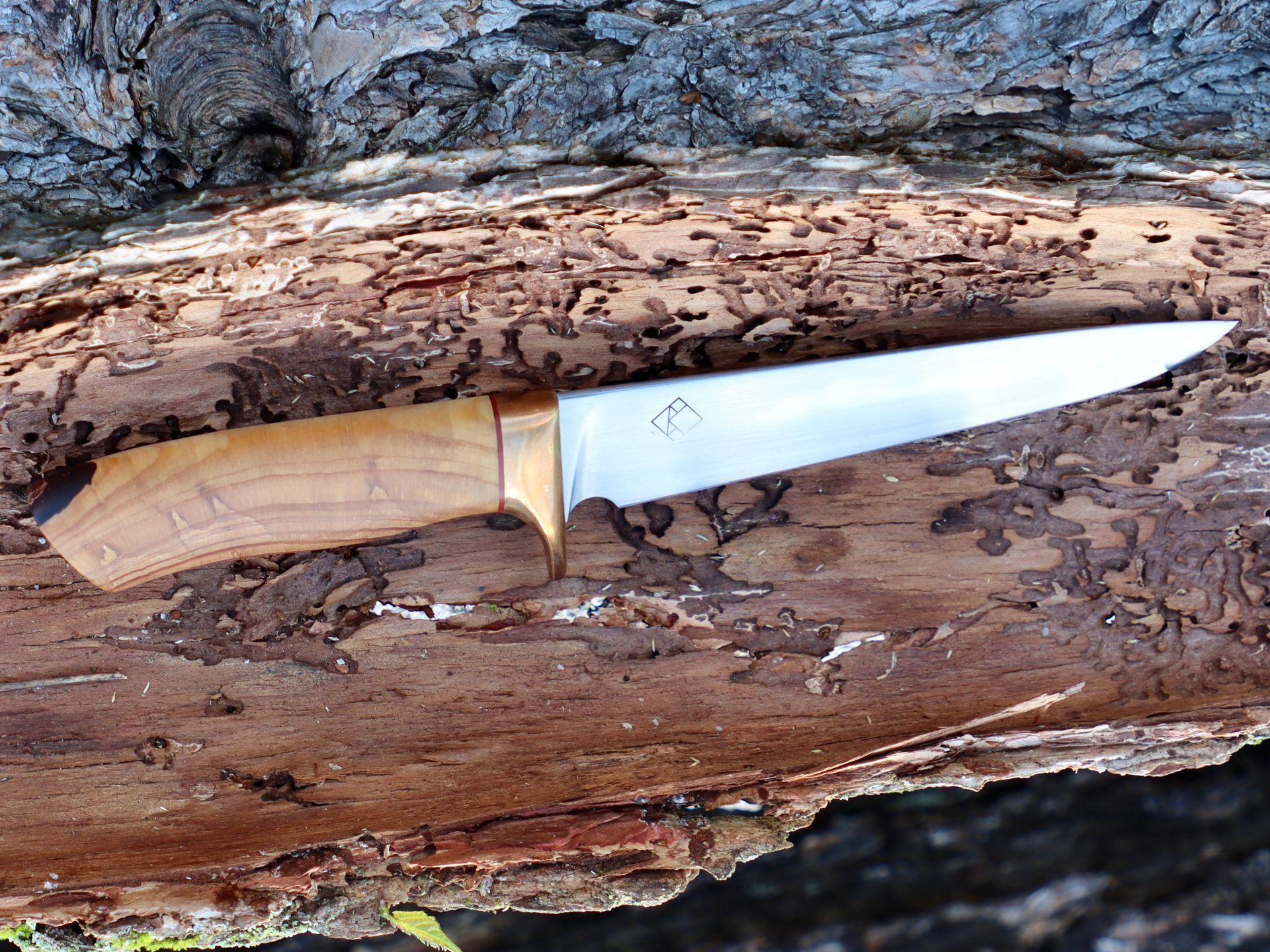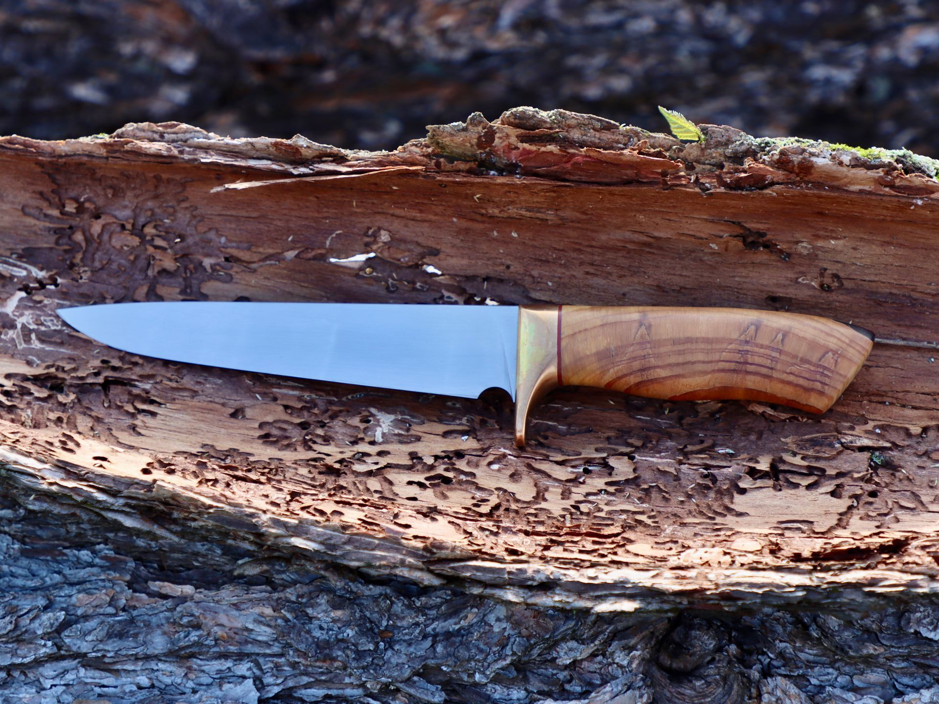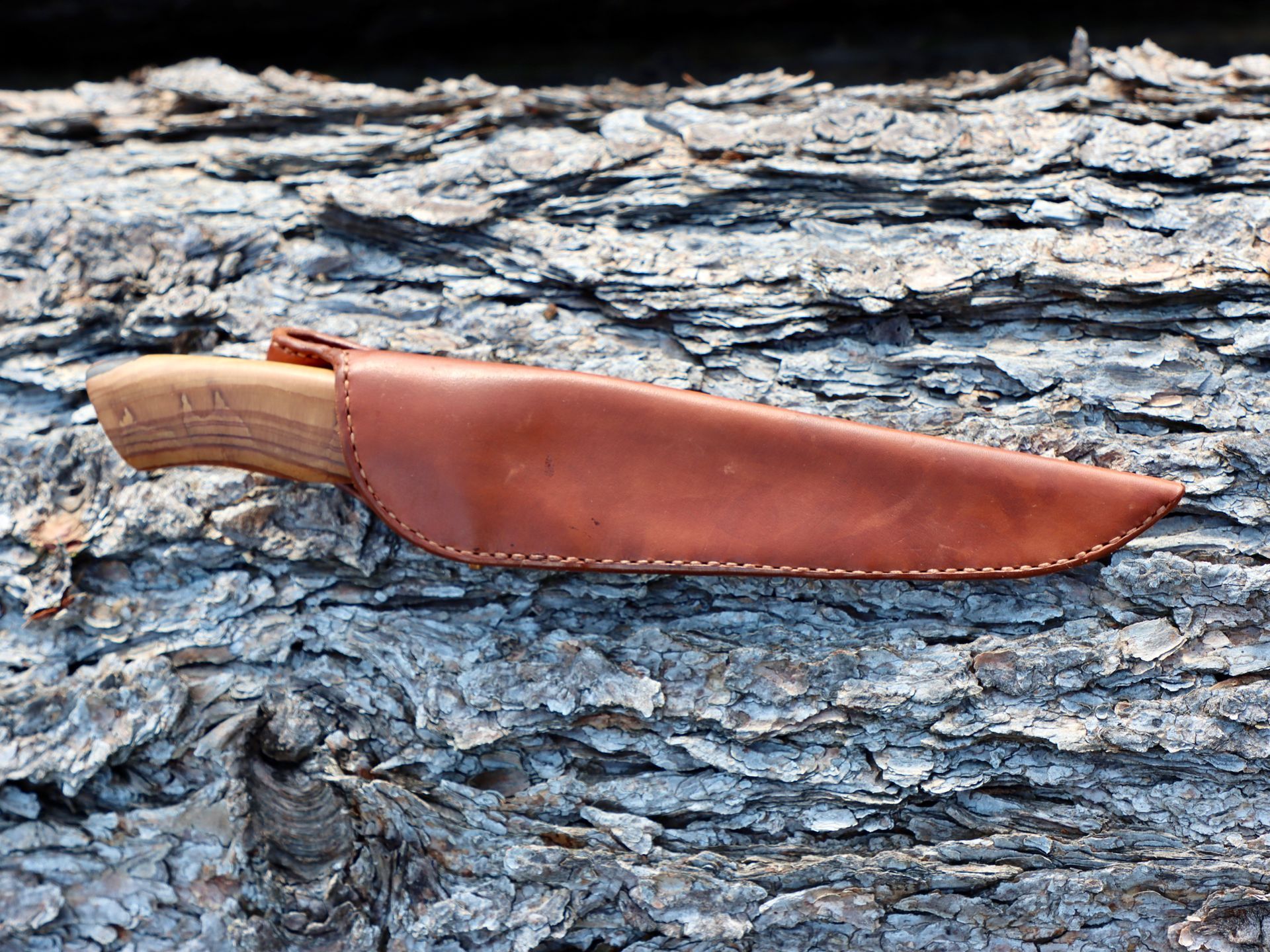 Messer aus Ck75, Griff aus Lärchenholz, Parierelement aus Messing, Scheide aus gefüttertem Rindsleder