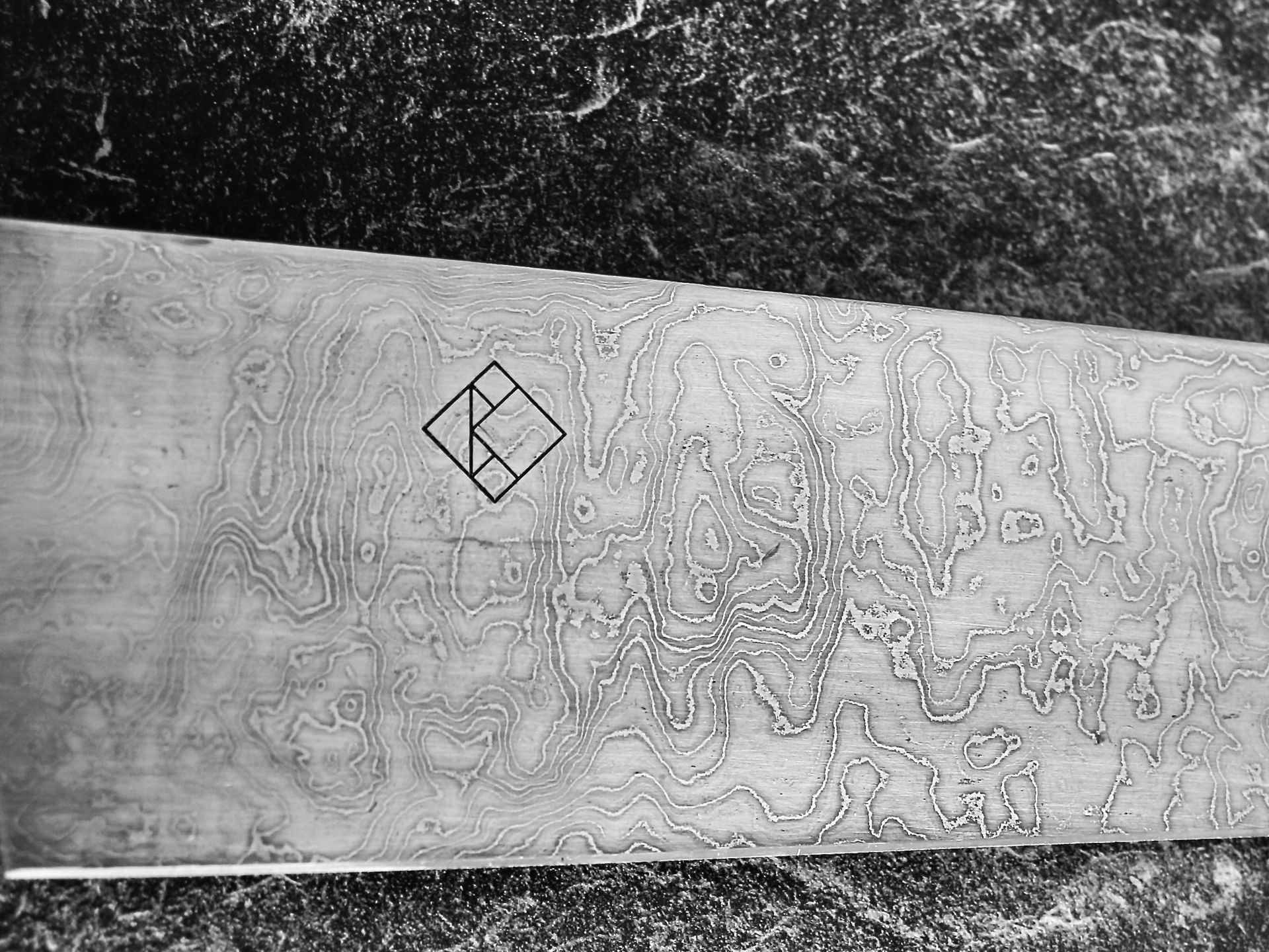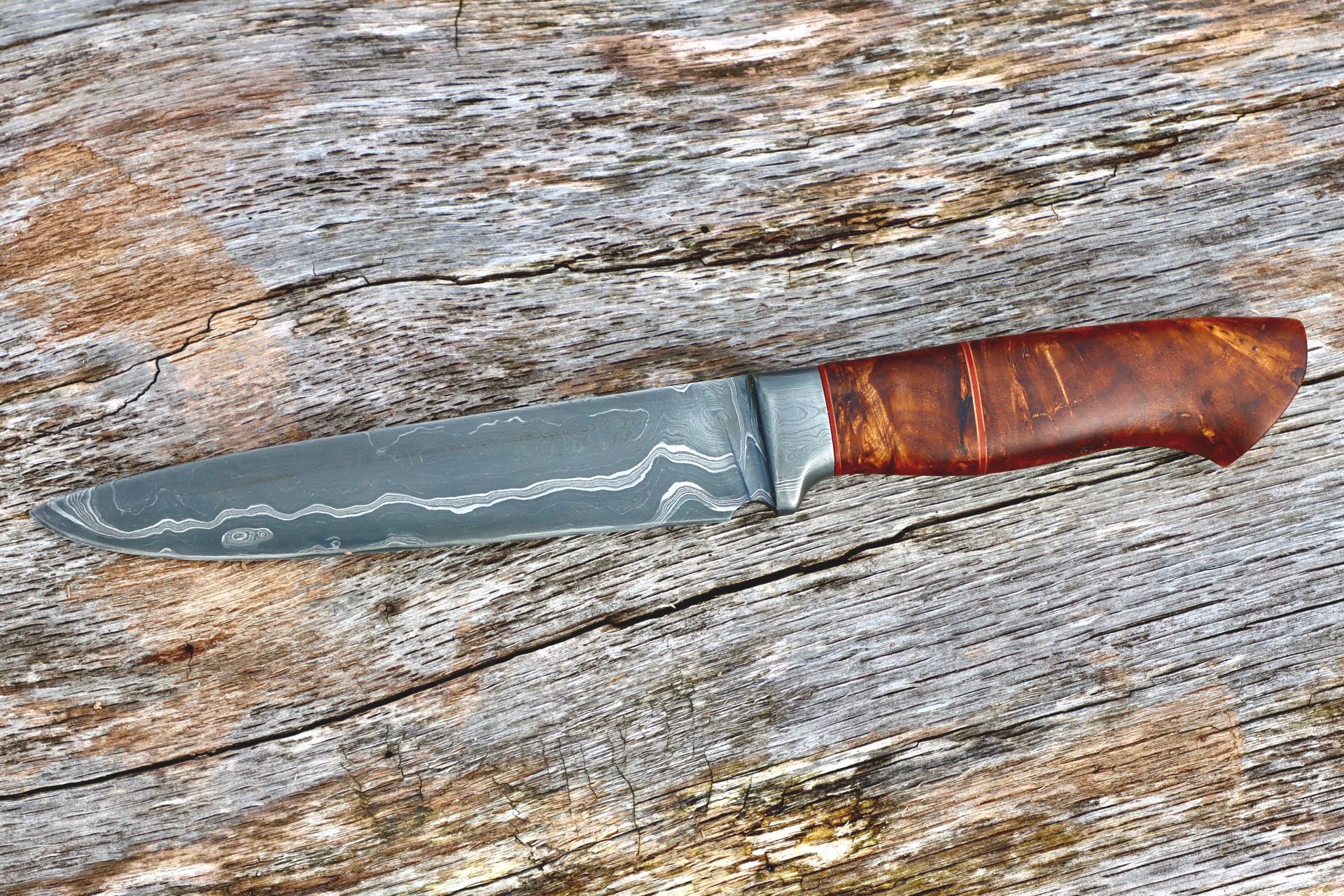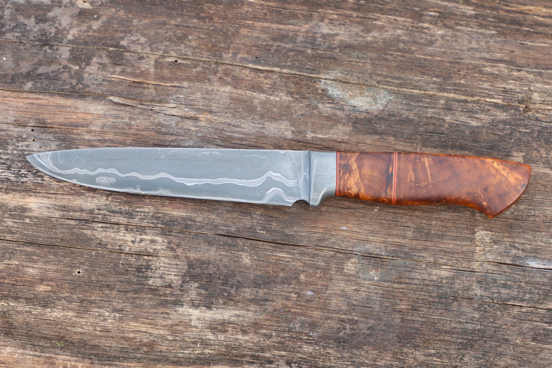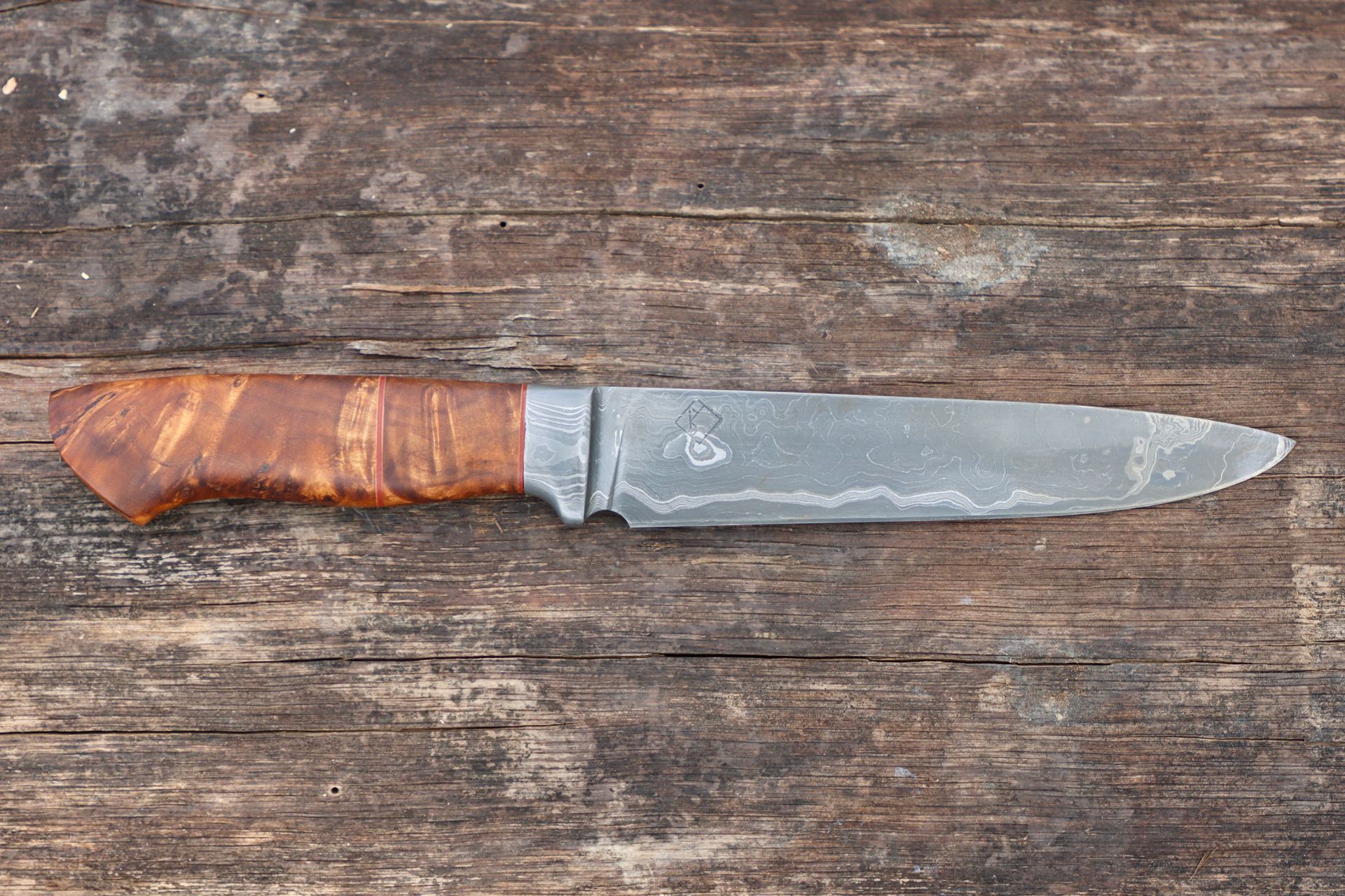 Integralmesser aus wildem Damast, Griff aus Weidenholz, Scheide aus Rindsleder