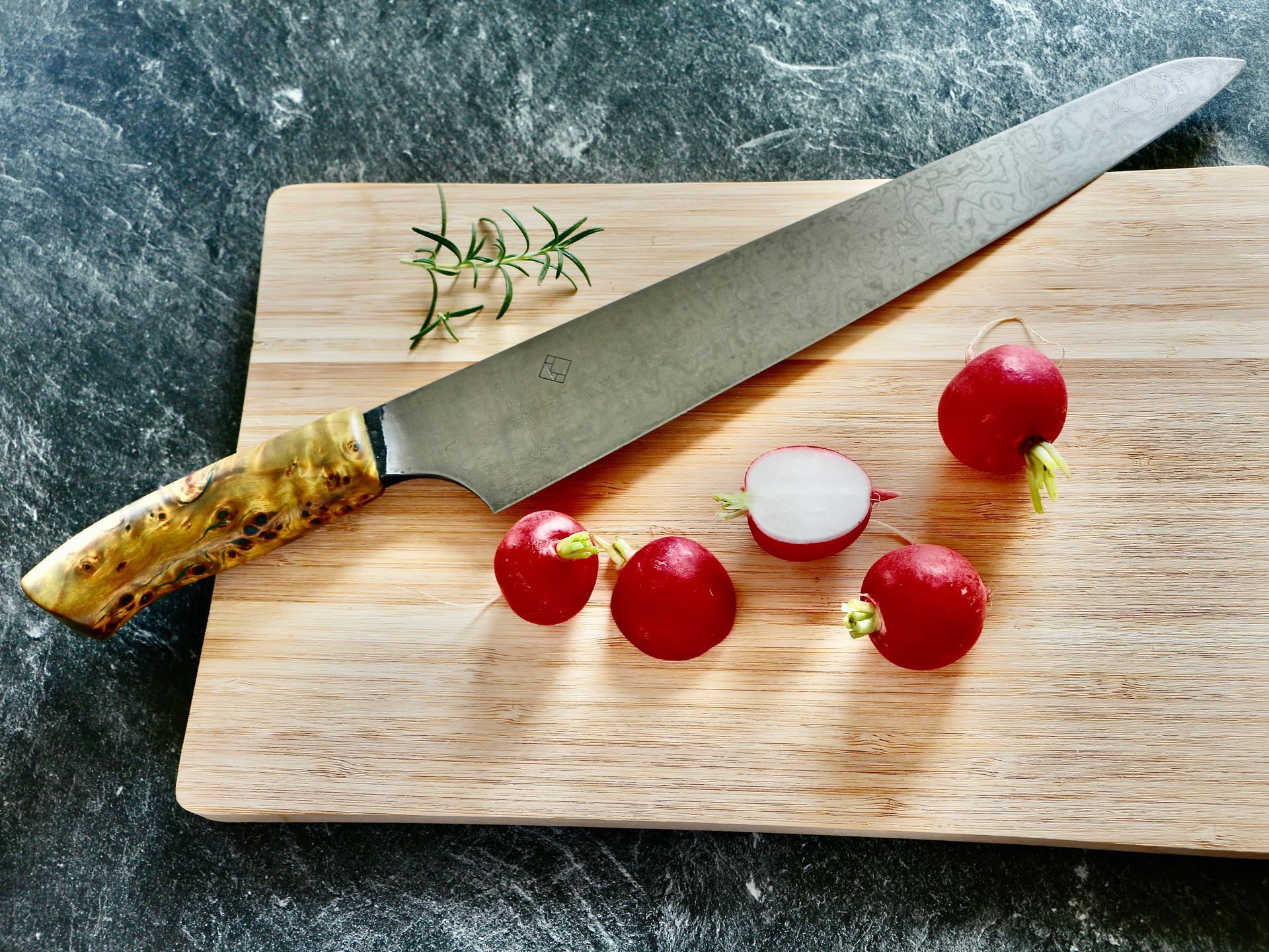 In diesem Messer habe ich drei herausragende Küchenmesserstähle verarbeitet. Durch ihren hohen Kohlenstoffgehalt nehmen sie eine sehr hohe Härte an, lassen sich jedoch nicht ganz so einfach verschweißen.